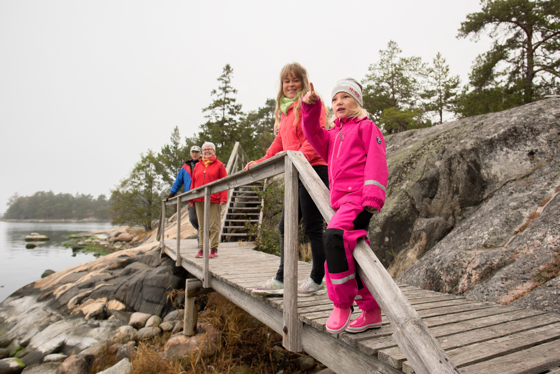 Naturstigen går längs bergen till stranden och till slätbergen som formats av hav och is. Från stranden stiger man igen upp längs trappor till berget. Endast sega martallar, växter, mossar och lavar har rotat sig i bergsskrevorna.
