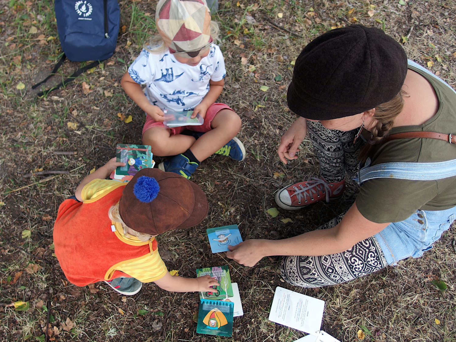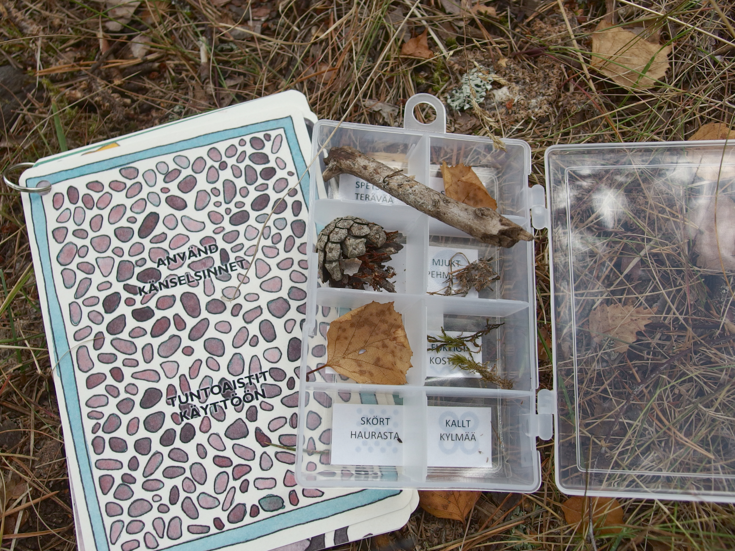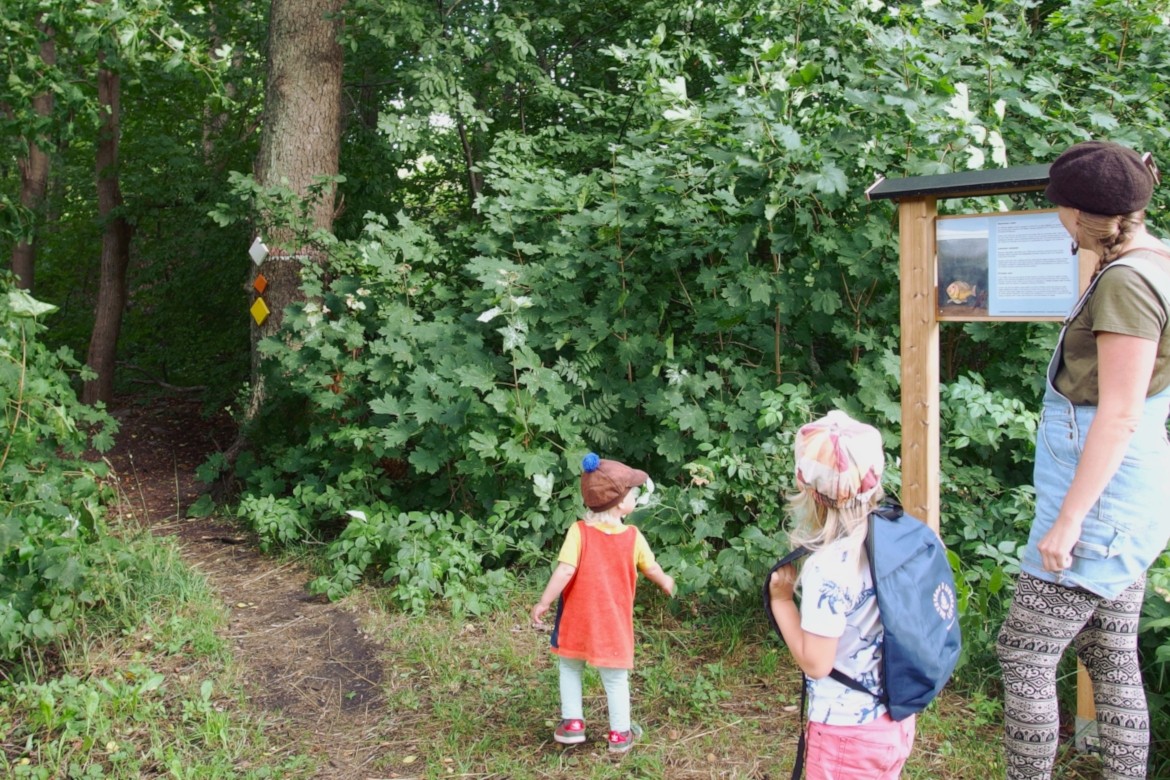 En ryggsäck innehåller redskap för två naturforskare. I ryggsäcken hittar du instruktioner för vad du ska göra och de redskap du behöver för att utföra uppgifterna. Syftet med uppgifterna är att väcka olika sinnen och öva sig på precision och balans. Rekommenderad ålder för uppgifterna är 6-8 år och det är värt att reservera helst en timme för att utforska stigen.