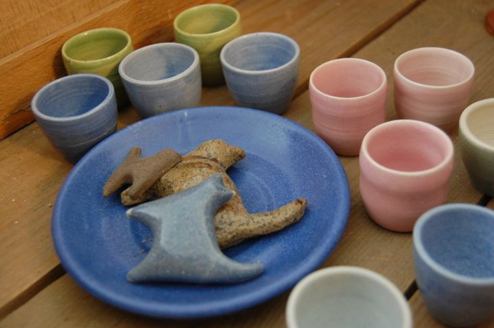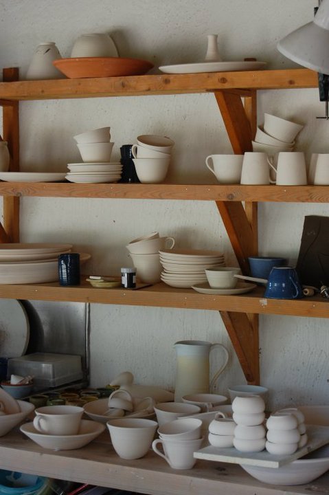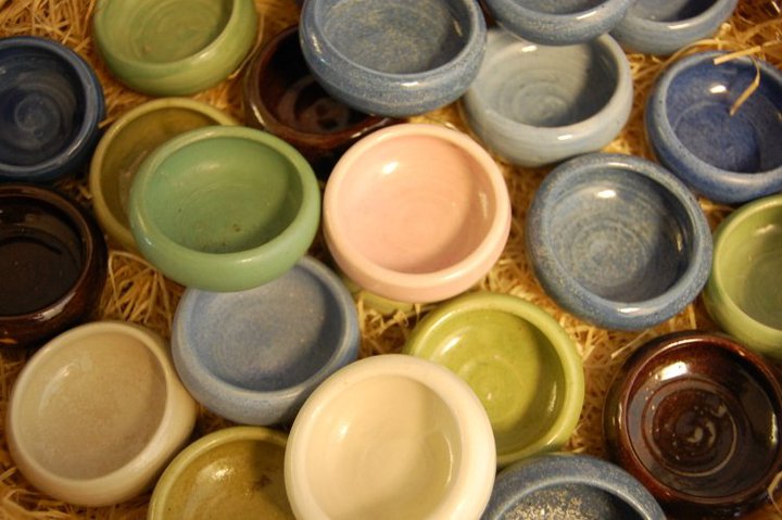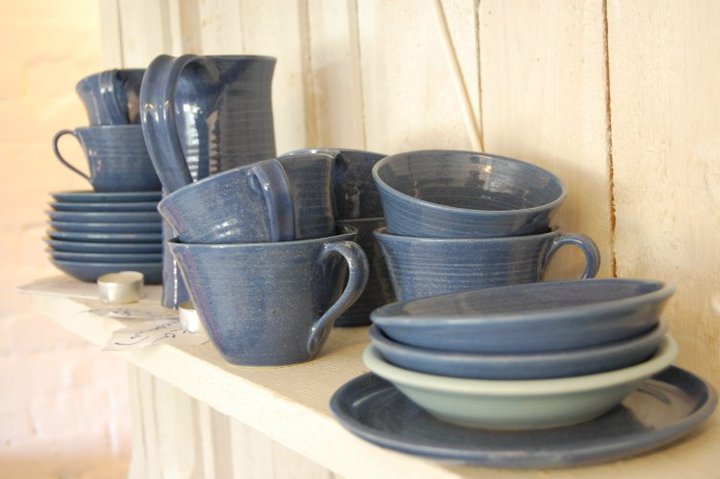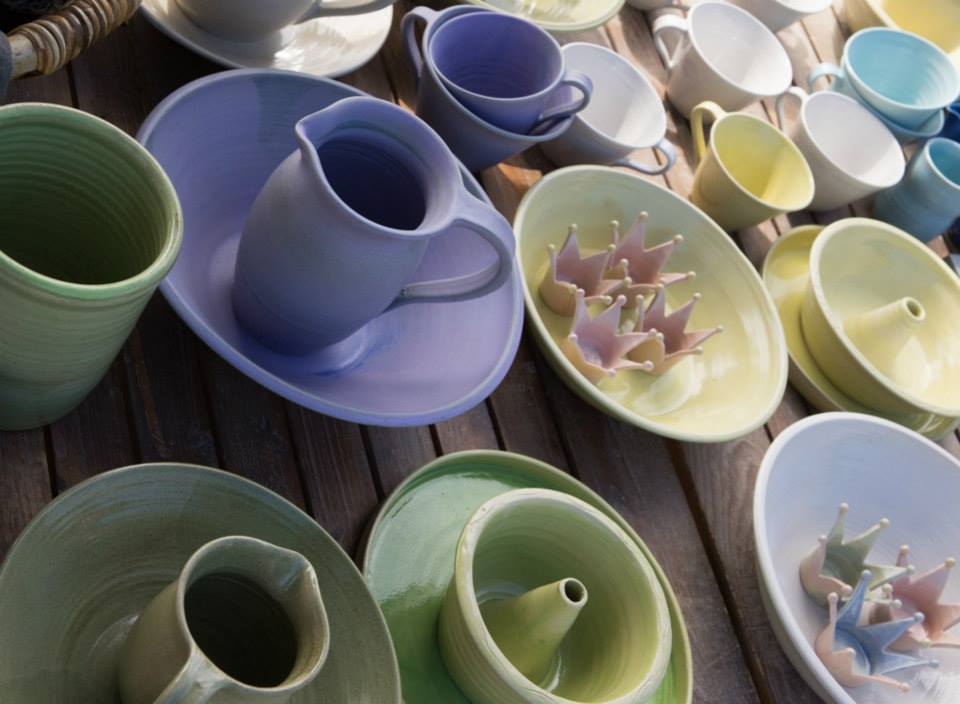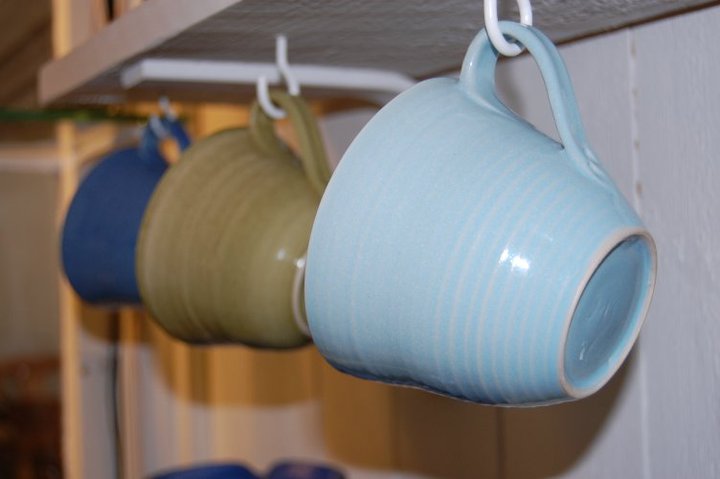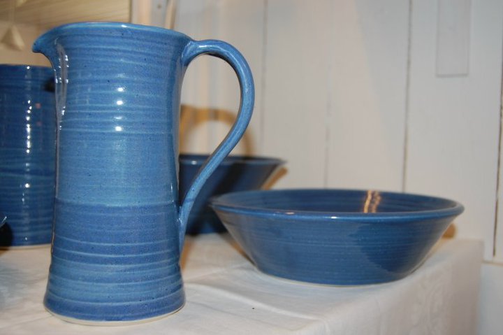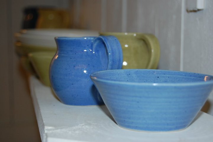 Till min produktion hör bl.a. drejade muggar, koppar, fat och kannor i olika färger.
