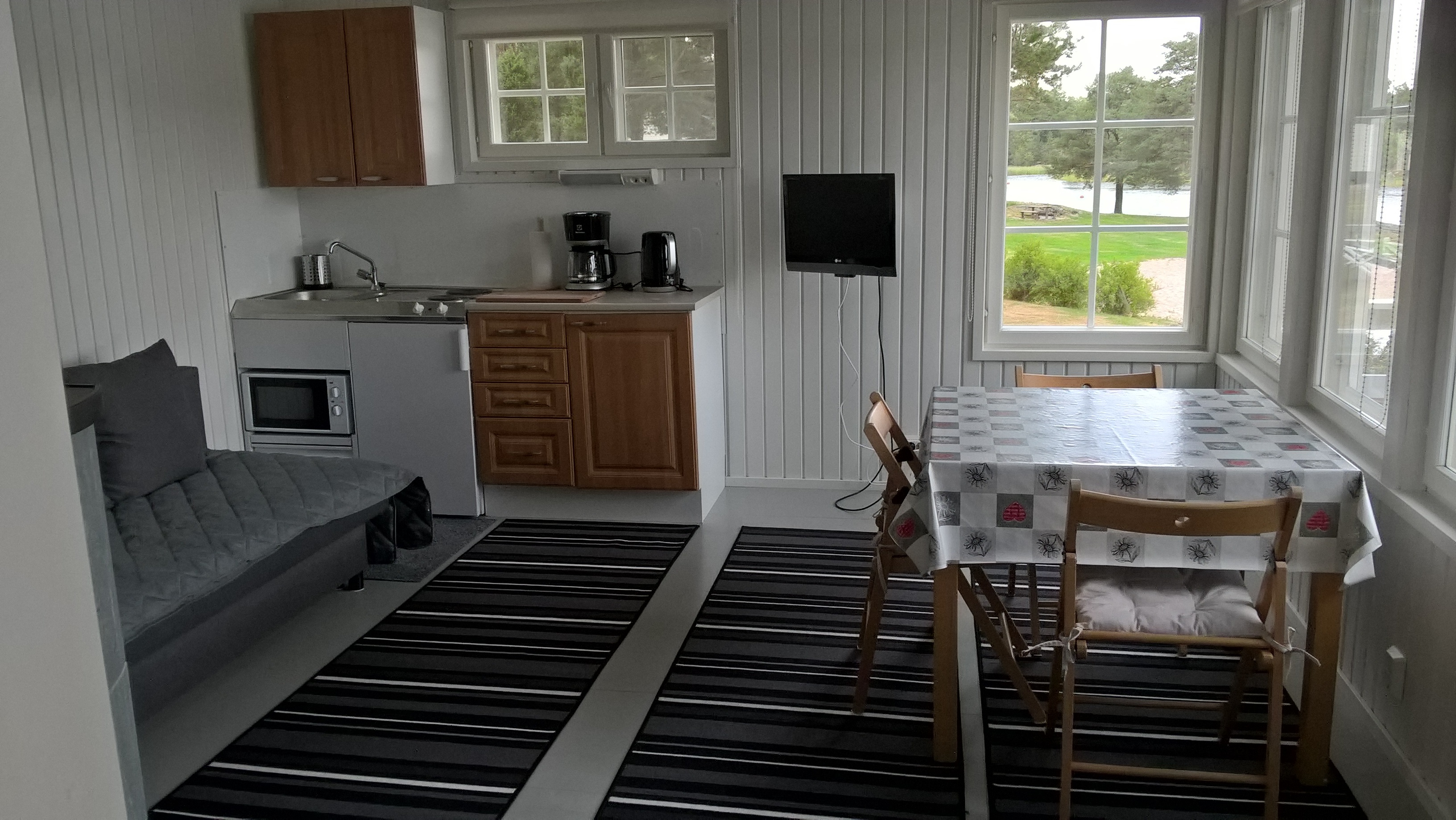 Bäddsoffa för två personer, elspis, kylskåp, mikrovågsugn, kaffekokare, vattenkokare, TV, rinnande kallt vatten (vintertid bärs vattnet från huvudbyggnaden 50 m) , el-värme, brasugn, gasgrill, ekologisk WC, bastu med vedvärme i samma byggnad. En roddbåt finns till förfogande.