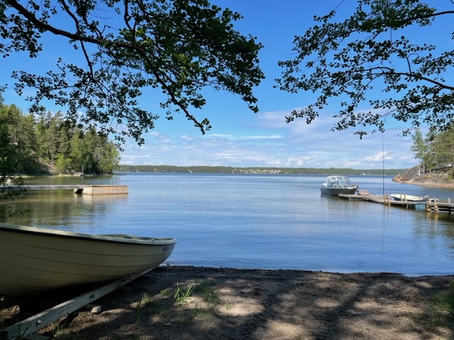 Ca 600 meter till stranden som vätter mot nord-nordost. Strandrätt och användningsrätt av ett stort fiskevattensområde. Roddbåt finns till förfogande. Man kan även hyra en motorbåt Buster M2 + Yamaha 40 hp separat!