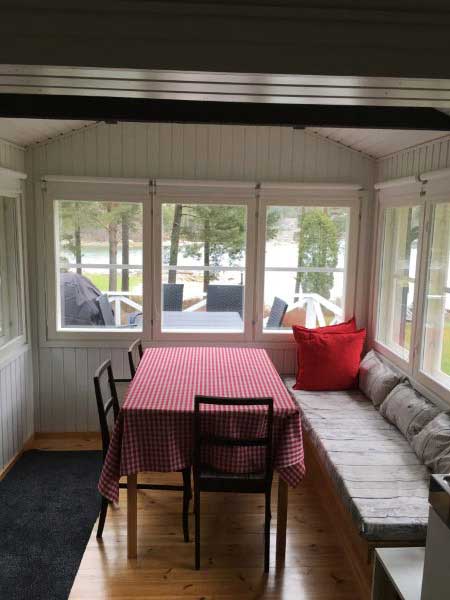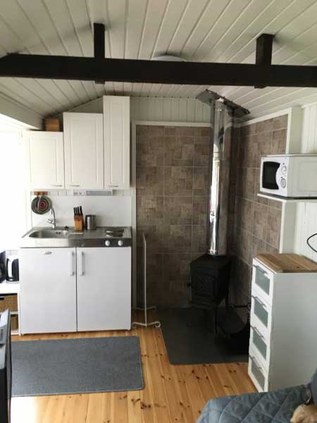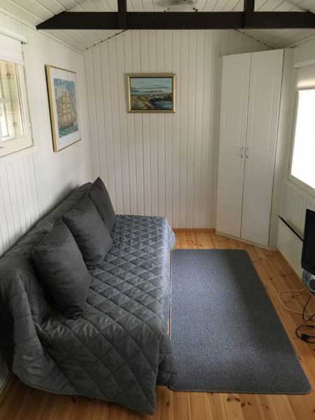 Bäddsoffa för två personer, elspis, kylskåp, mikrovågsugn, kaffekokare, vattenkokare, TV, rinnande kallt vatten (vintertid bärs vattnet från huvudbyggnaden 50 m) , el-värme, brasugn, gasgrill, ekologisk WC, mölighet till dusch. Bastu kan användas 1 gång per dag 1,5h. Roddbåt kan fritt användas.