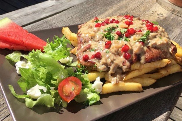 I den hemtrevliga uteserveringen eller inne i den mysiga traditionella matsalen kan du njuta av läckra hembakade kakor och smaklig hemlagad mat. Vi har även A-rättigheter och ordnar många stämningsfulla tillställningar under sommaren, med gästande trubadurer och andra musiker.
