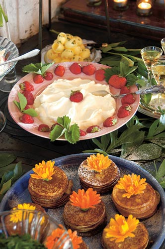 I den fridfulla gårdsmiljön kan du avnjuta läckra hembakade kakor och fräscha sommarrätter.